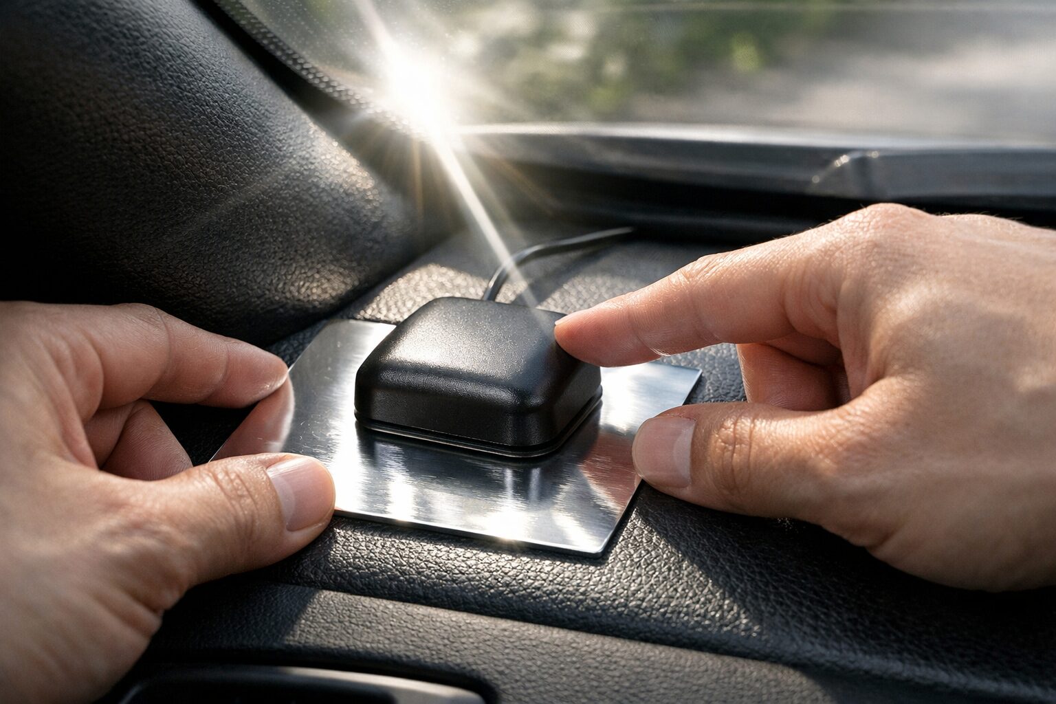 GPSアンテナは、上空にある衛星からの電波をキャッチするため、上方に遮るものがない「水平な場所」に設置するのが鉄則です。ダッシュボードの樹脂や内部の金属フレーム、配線の束などが障害物となり、受信感度を著しく低下させます。特に感度が悪いと感じているなら、まずはアンテナを表に出し、フロントガラスの下、かつピラー(柱)から10cm以上離した水平な位置に再設置してみてください。