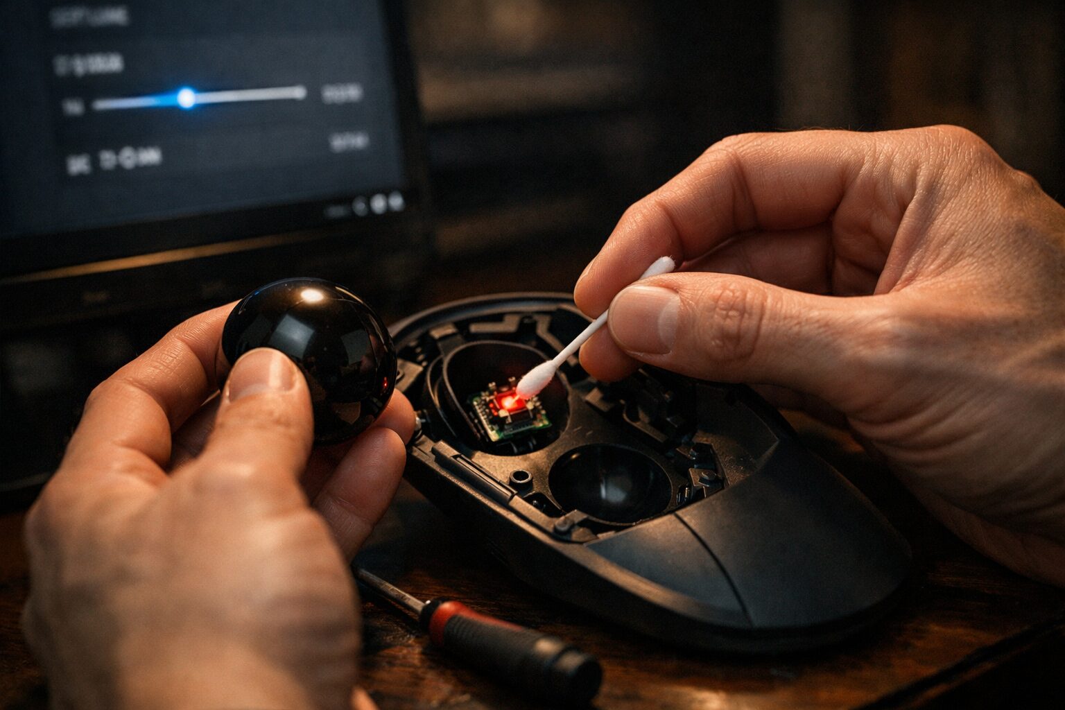 トラックボールを使い続けていると、「カーソルの動きが鈍い」「引っかかる感じがする」というトラブルに見舞われることがあります。これは故障ではなく、ほとんどの場合「汚れ」が原因です。ボールを支える支持球(ルビー球など)に手垢やホコリが溜まると、ボールの滑りが悪くなり、センサーの読み取り精度も低下します。