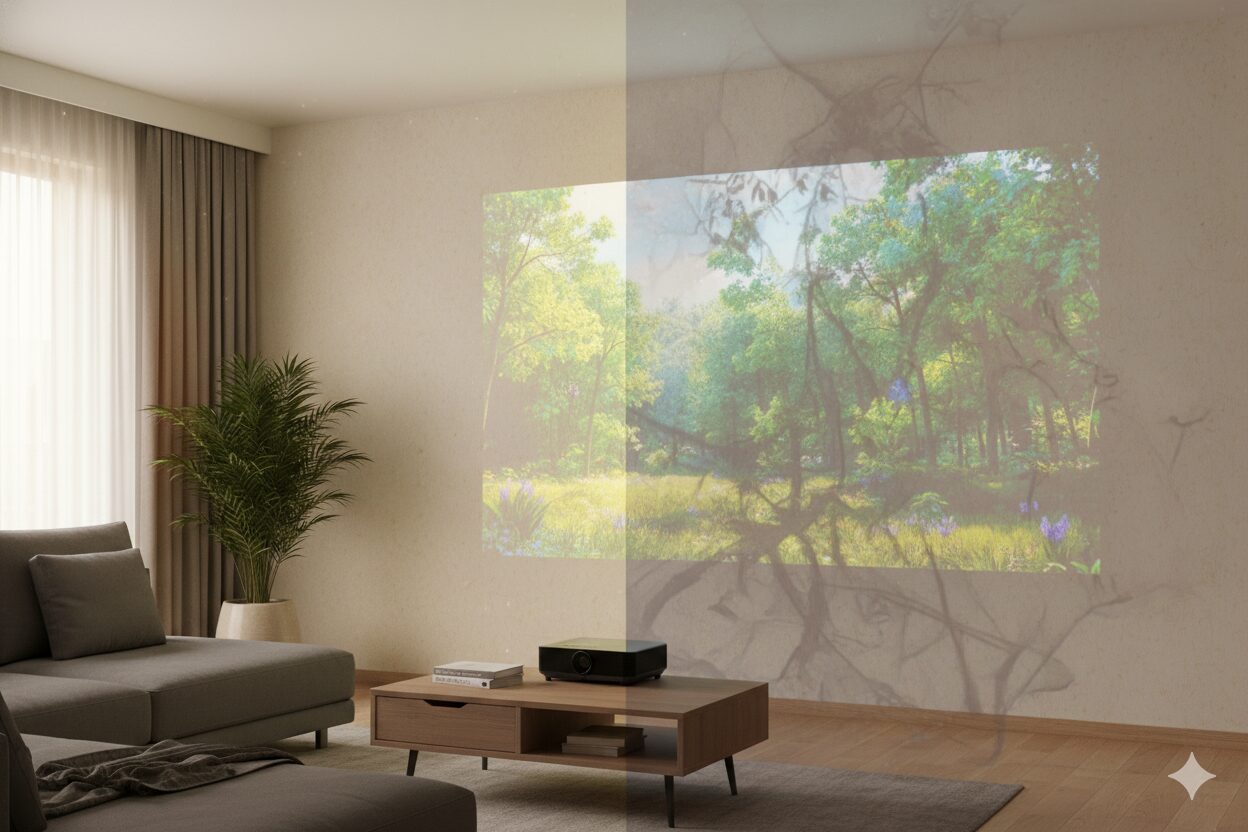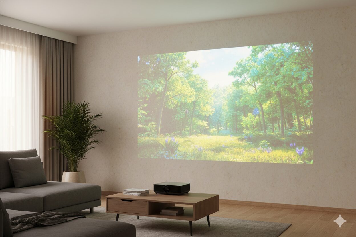 壁に投写する場合、その「壁の色」も画質に深刻な影響を与えます。白い壁は、最も一般的で、映像を明るく見せる効果があります。しかし、光を強く反射しすぎるため、映像の「黒」が沈まず、白っぽく浮いて見えがちです。これにより、全体のコントラストが低く、締まりのない映像になります。