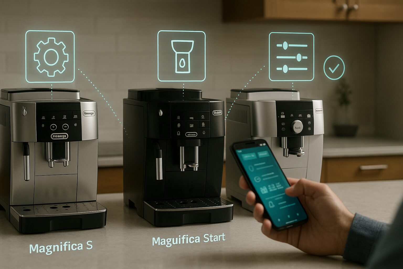 朝起きた瞬間に漂う挽きたての豆の香り、ボタン一つで抽出される黄金色のクレマが乗ったエスプレッソ。そんな贅沢な時間を自宅で当たり前に楽しめるのが、デロンギの全自動コーヒーマシンの魅力です。しかし、いざ購入しようとカタログや販売サイトを見てみると、見た目が似ているのに名前が少し違うモデルが並んでいて、どれを選べばいいのか立ち止まってしまう方は非常に多いです。特に、長年のベストセラーである「マグニフィカS」と、洗練されたデザインの新モデル「マグニフィカ スタート」のどちらにするかは、多くのコーヒー好きを悩ませる最大の難問と言えるでしょう。
