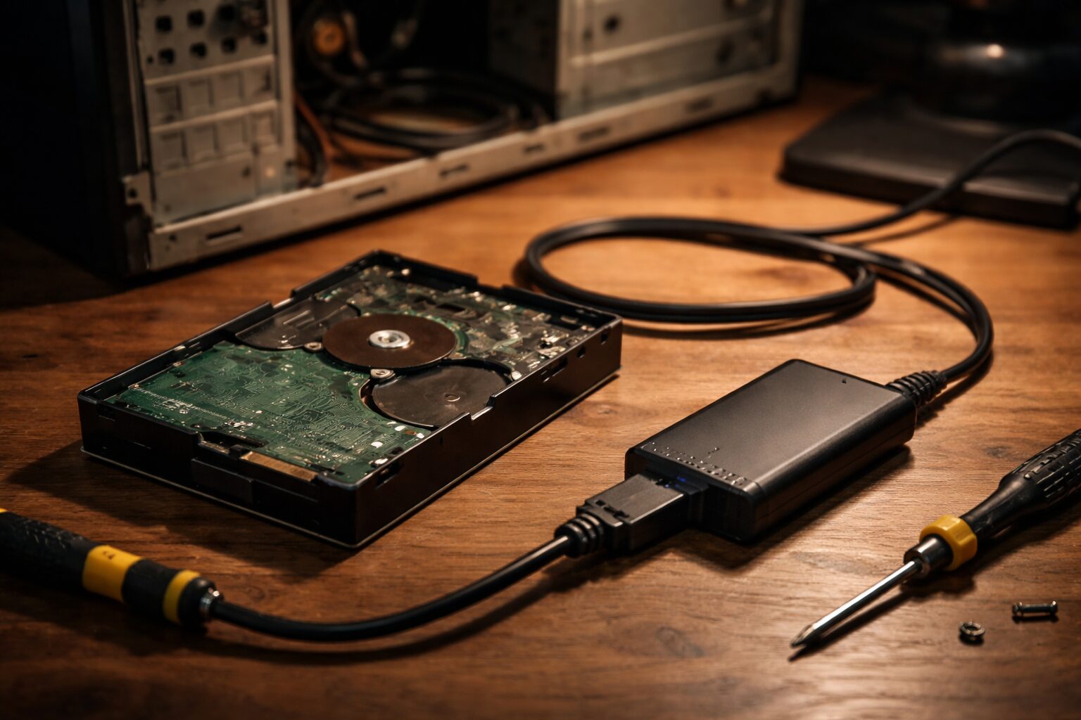 手順は簡単です。まずPCからHDDを取り出します(デスクトップなら側面パネルを開け、ノートなら裏蓋を外します)。次に、用意したHDDケースにHDDをセットし、コネクタをしっかり接続します。最後にケースの蓋を閉め、付属のUSBケーブルで新しいPCに繋ぐだけです。3.5インチHDDの場合は、さらに付属のACアダプターをコンセントに繋いで電源を供給する必要があります。これで、内蔵HDDが外付けUSBドライブとして認識されます。