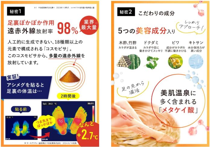 このコスモビサは、なんと遠赤外線放射率が98%という驚異的な素材。貼るだけで足裏がじんわりと温まり、その温度は+2.7℃も上昇するというデータもあるそうです。