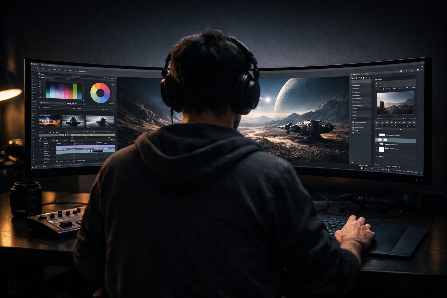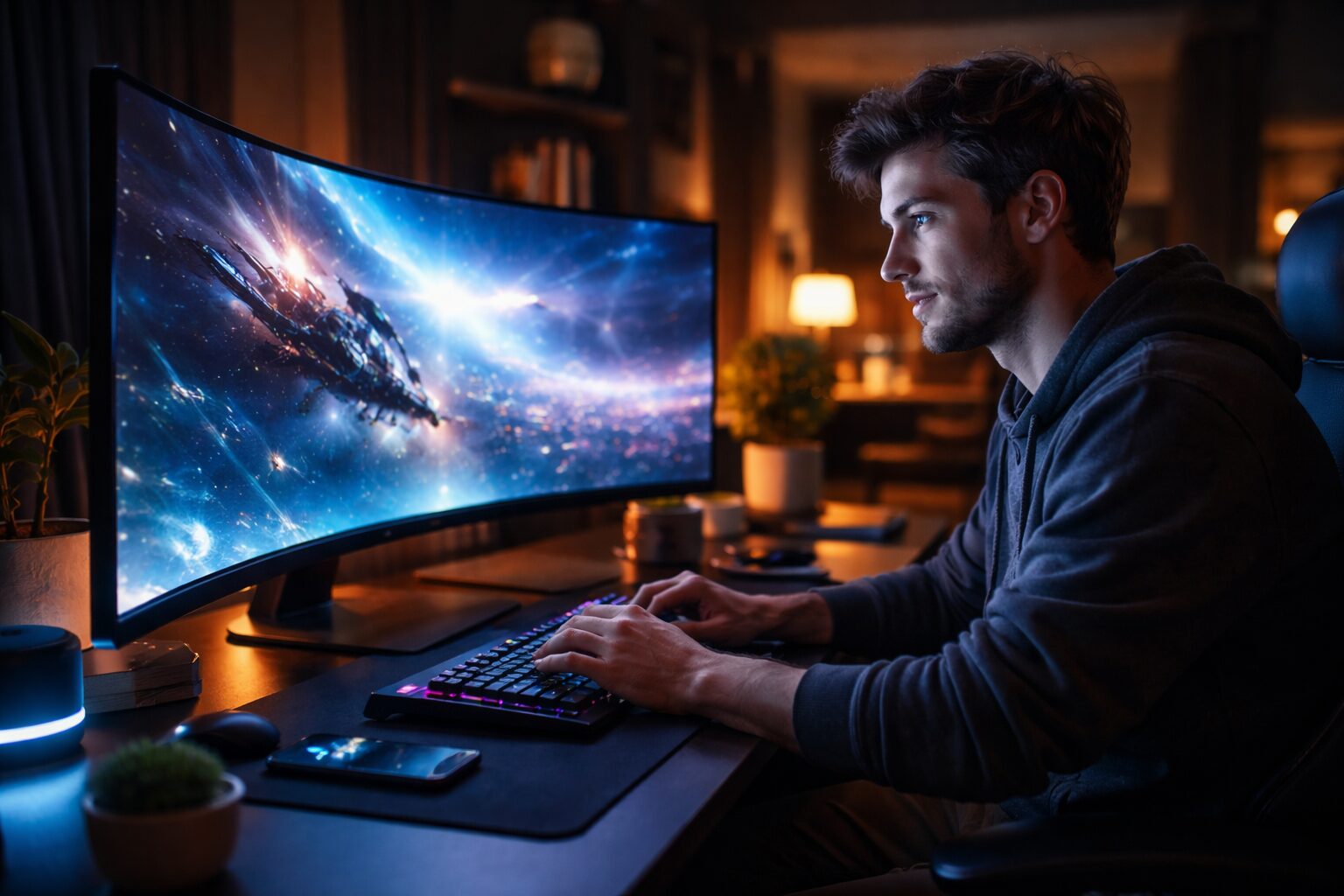 湾曲モニターが真価を発揮するのは、やはりエンターテインメントの分野です。「動画視聴」や「ゲーム」においては、画面が視界を覆うように広がることで、まるでその場にいるかのような臨場感を味わえます。特にフライトシミュレーターやレーシングゲームでは、周辺視野に流れる景色がリアルに感じられ、平面モニターでは得られない体験が可能です。