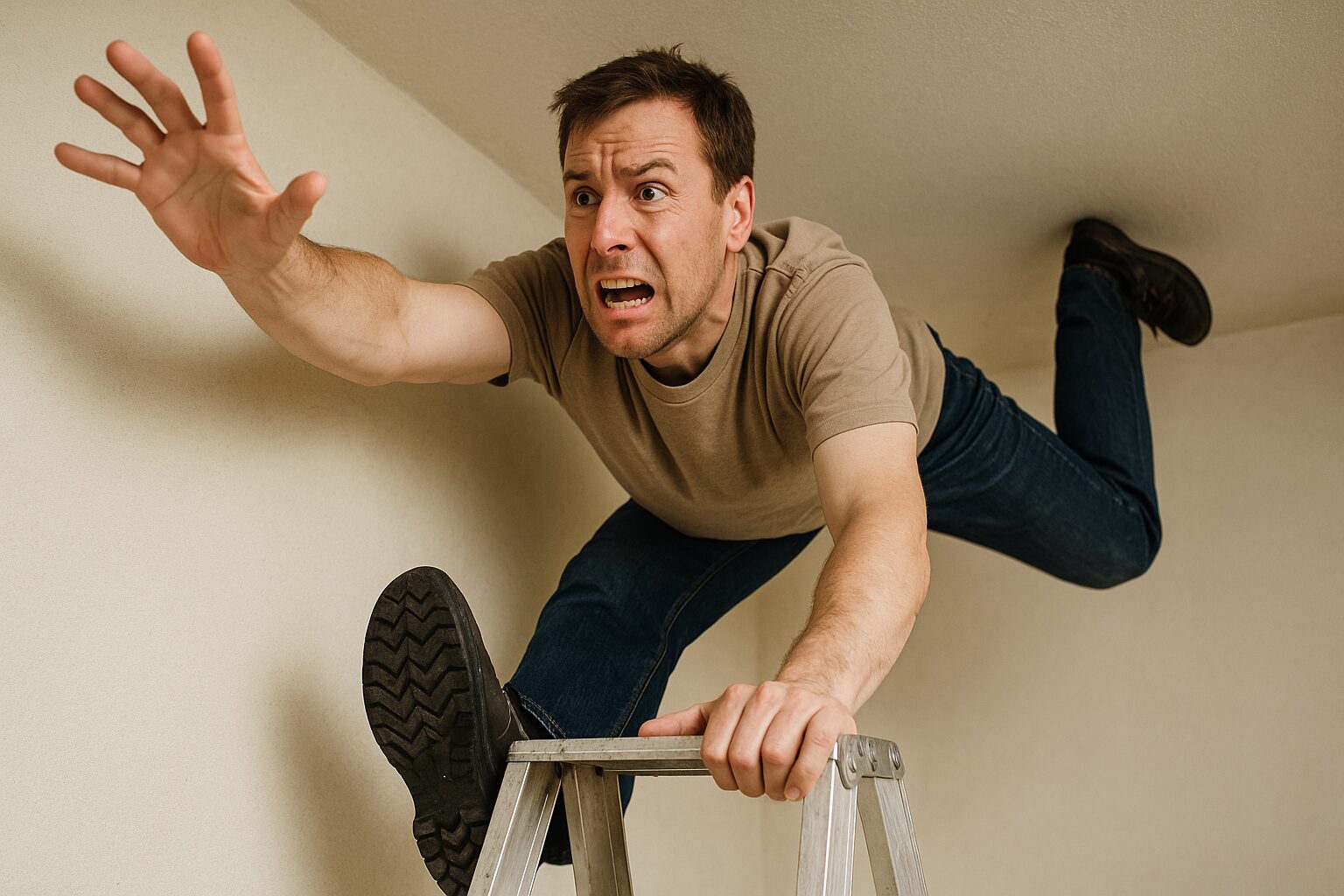 脚立の高さがわずかに足りない場合、天板に乗るほどではないけれど、つい爪先立ちになったり、背伸びをしたりして作業しようとすることがあります。これもまた、非常に危険な行為です。脚立の踏み板(ステップ)は、足裏全体をしっかりと乗せて安定した姿勢で作業できるように設計されています。爪先立ちや背伸びをすると、重心が高くなるだけでなく、足元の接地面が極端に小さくなり、非常に不安定な状態になります。
