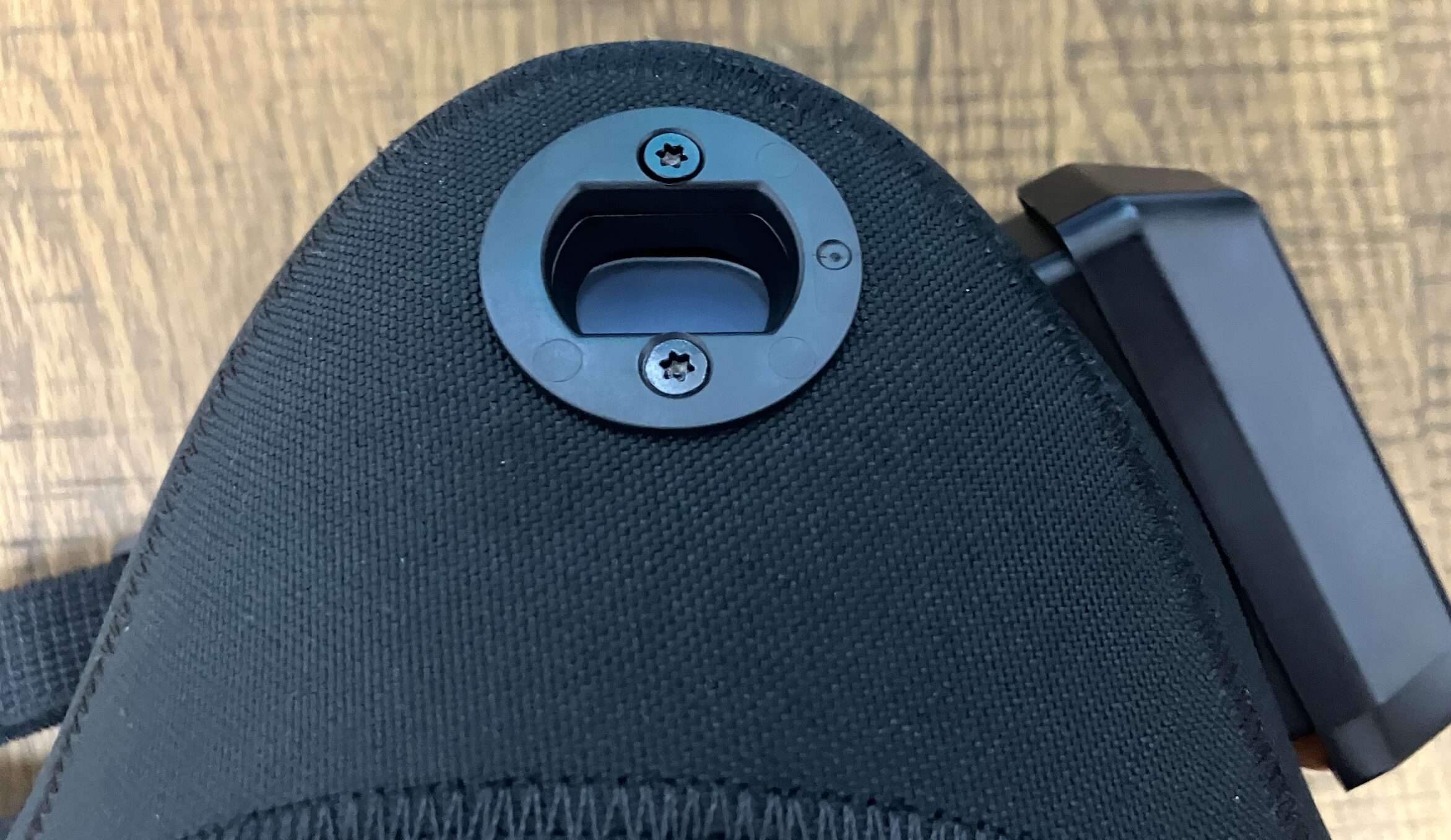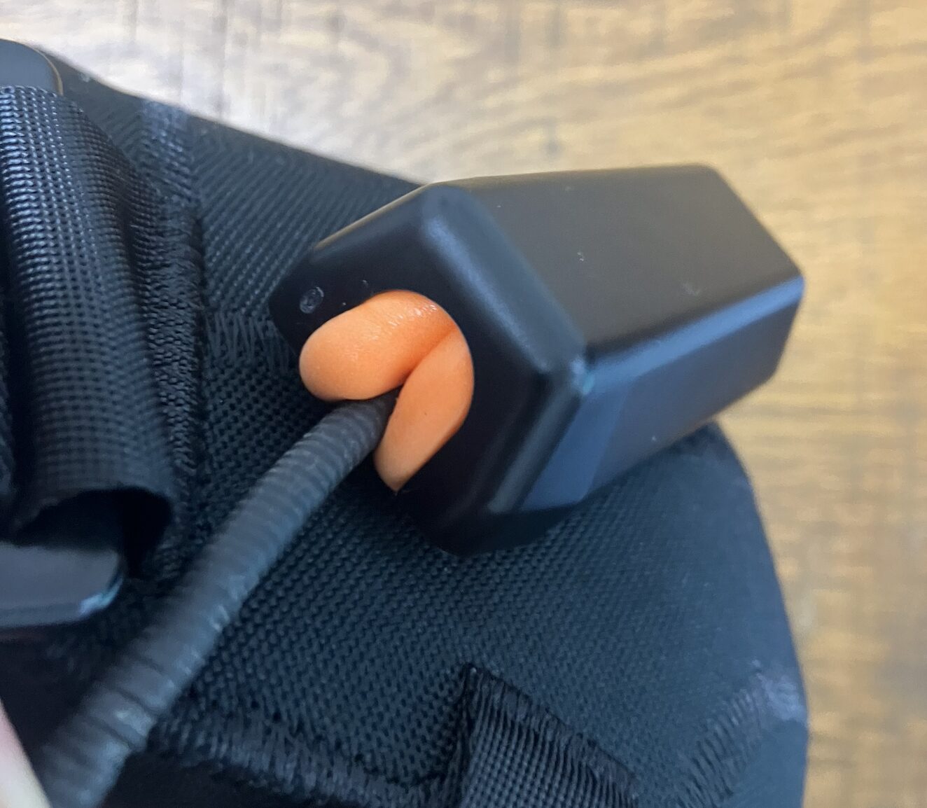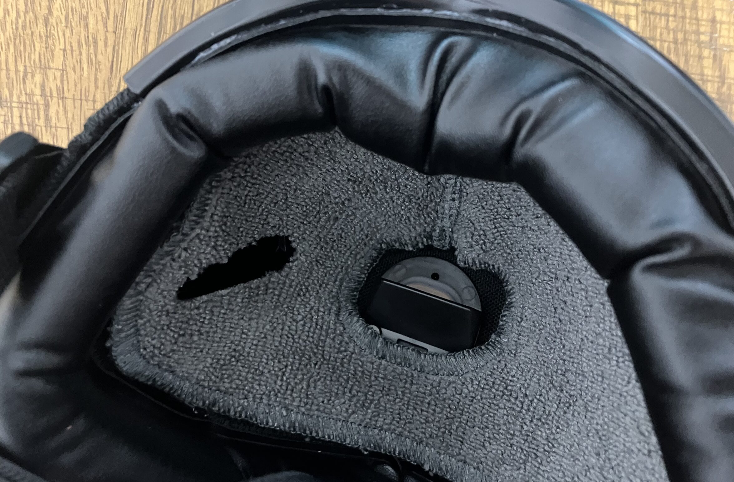 ヘッドホンのマイクとOMBRA v2は磁石付きのマイクポートを使ってマスクにカッチリと固定できます。マイクを入れる部分についても、オレンジのスポンジがしっかり隙間を埋めるため、声が外に漏れる心配がありません。