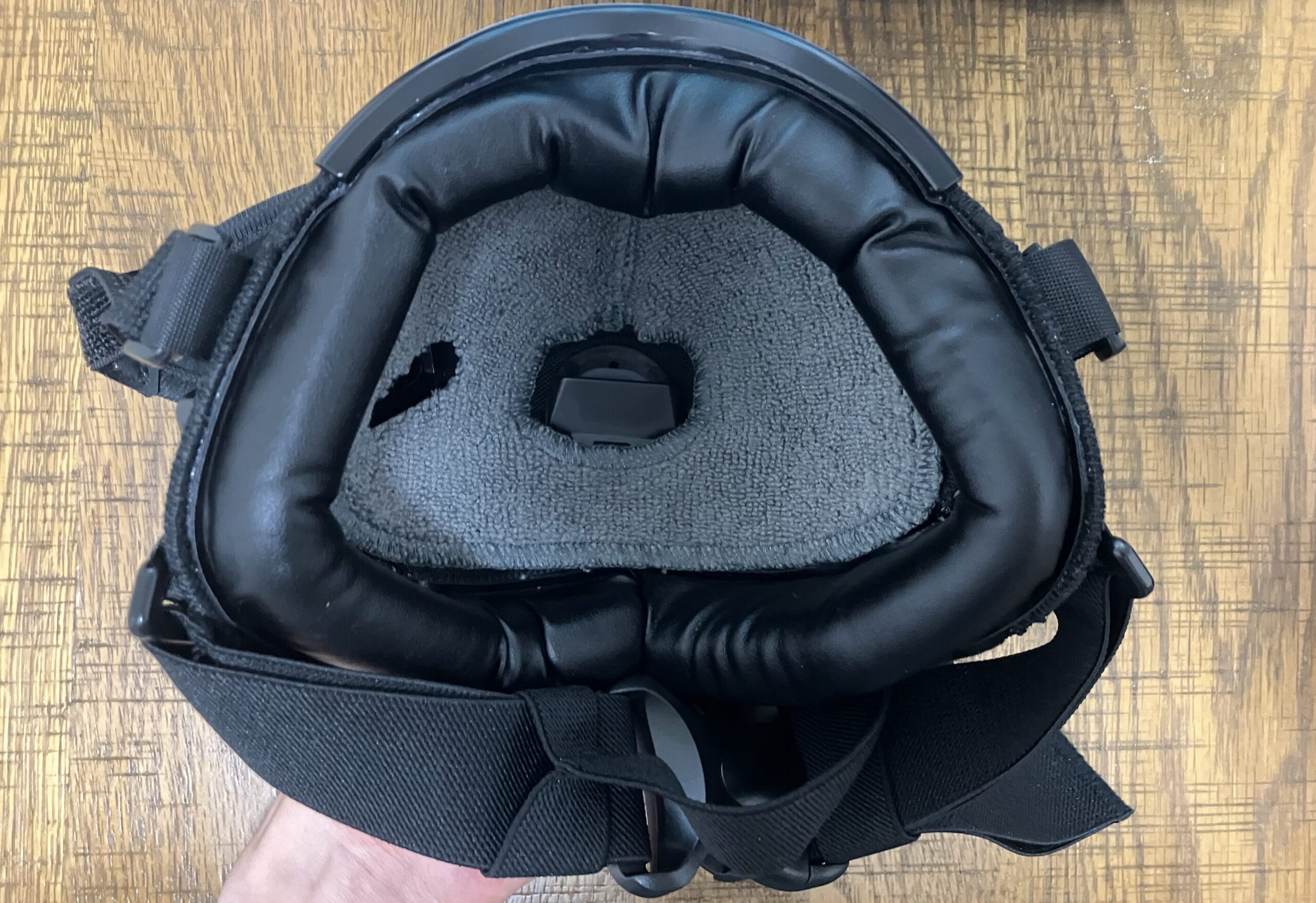 少し違う角度から。中央部分には長時間の着用も安心な通気口が備わっています。
