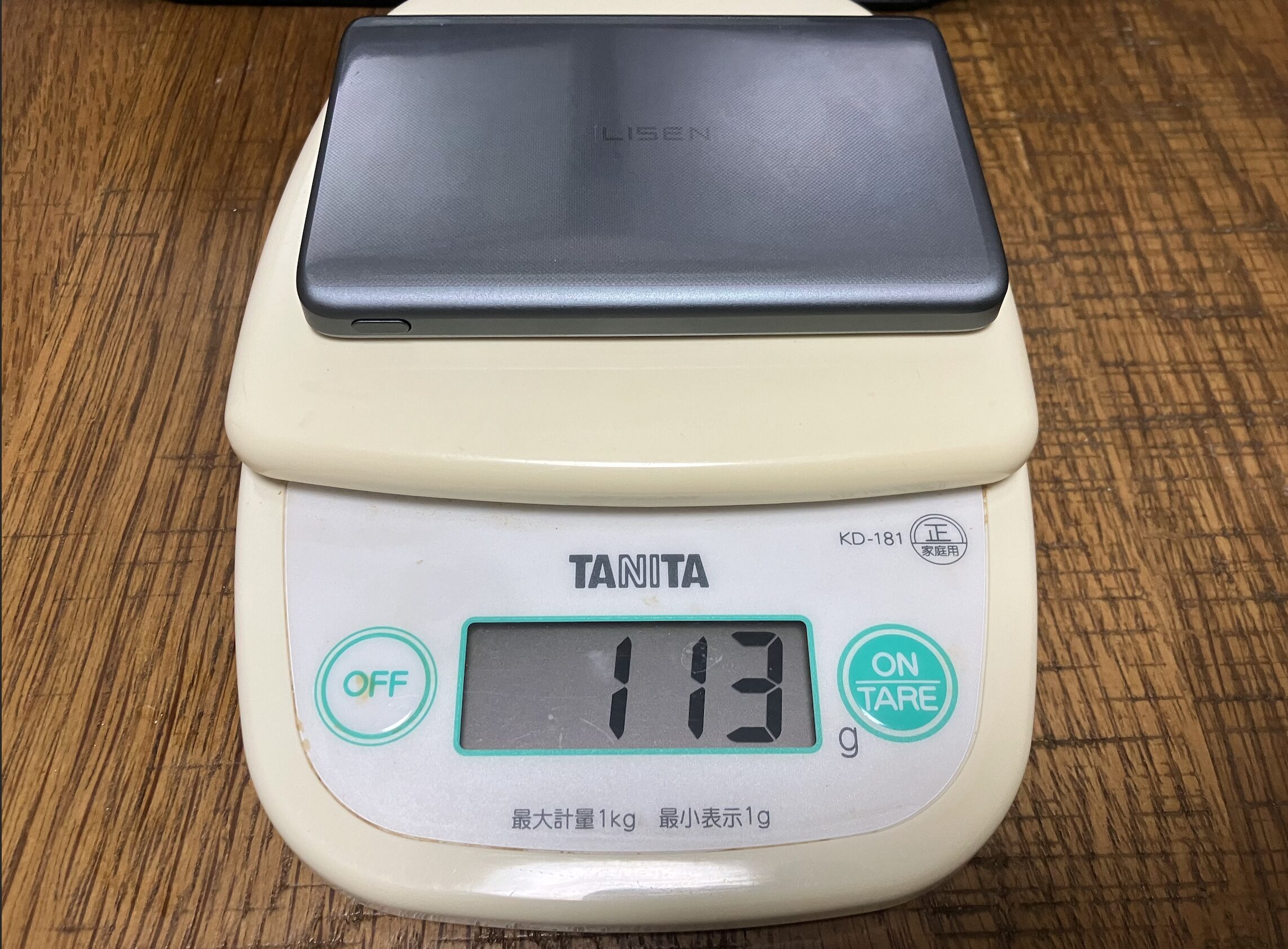 このバッテリーを語る上で、衝撃的な軽さは外せません。わずか113gという数値は、一般的な5000mAhクラスのモバイルバッテリーと比較しても群を抜いています。それはまるで、いつも使っているiPhoneケースをもう一枚重ねる程度の感覚。