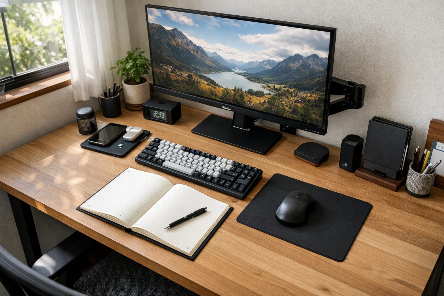 奥行き60cmのデスクは、工夫次第でおしゃれで機能的なワークスペースに変身します。ポイントは「天板の上を広く見せること」です。モニターアームを使ってモニターを宙に浮かせれば、スタンドがなくなってスッキリするだけでなく、モニター下のスペースを有効活用できます。そこに観葉植物やインテリア小物を置くことで、無機質になりがちなPC周りに彩りを添えることができます。