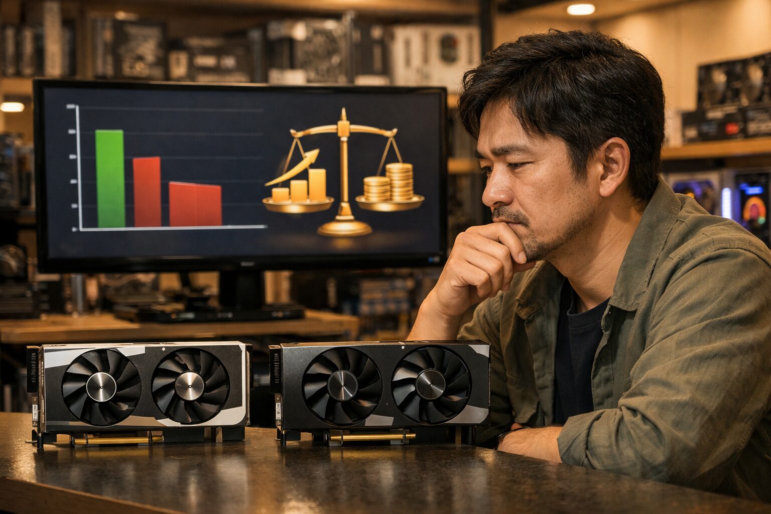 現在、新品市場では3070の在庫が減少し価格が高騰している傾向にあり、中古市場でも価格差が数千円〜1万円程度あります。コストパフォーマンスを最優先するなら3060 Tiが優秀ですが、少しでも高い性能を確保したい、あるいは4K解像度でのプレイも視野に入れているなら、3070(もしくはさらに上の3080)を検討する価値があります。しかし、フルHD〜WQHD環境であれば、3060 Tiで十分満足できるケースが大半です。