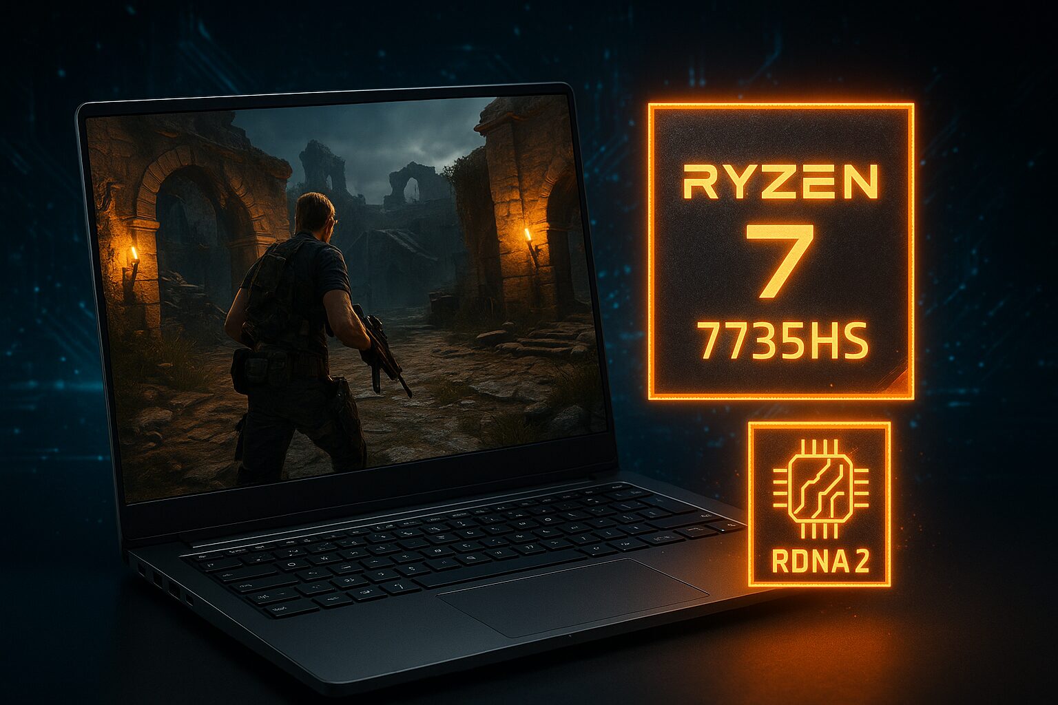Ryzen 7 7735HSの価値を決定づけているのが、内蔵されているGPU「AMD Radeon 680M」です。この内蔵グラフィックこそが、dGPU非搭載ノートPCの常識を覆した立役者。その秘密は、PlayStation 5やXbox Series X/Sといった最新ゲーム機にも採用されている「RDNA 2」アーキテクチャをベースにしている点にあります。これにより、従来の内蔵グラフィックとは比較にならないほどの高い描画性能と電力効率を実現しました。
